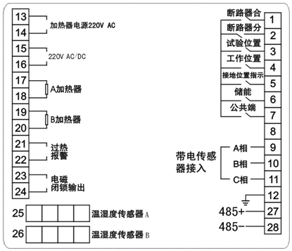 控制方式:可带1-2路加热器,当环境湿度≥90%RH或温度低于1℃时,启动加热;当环境湿度≤75%RH或温度高于6℃时,停止加热,当环境温度≥40℃时,加热无条件退出。若需手动加热时,按下加热器电源按钮,加热器加热;若无需手动加热时,再次按下加热器电源按钮,使其处于自动控制状态,加热器断电。断线报警:当任何一路加热器断线时,则断线报警指示灯亮。过热报警:环境温度≥50℃时,过热报警触点闭合,过热指示亮(或可根据用户要求启动排风)